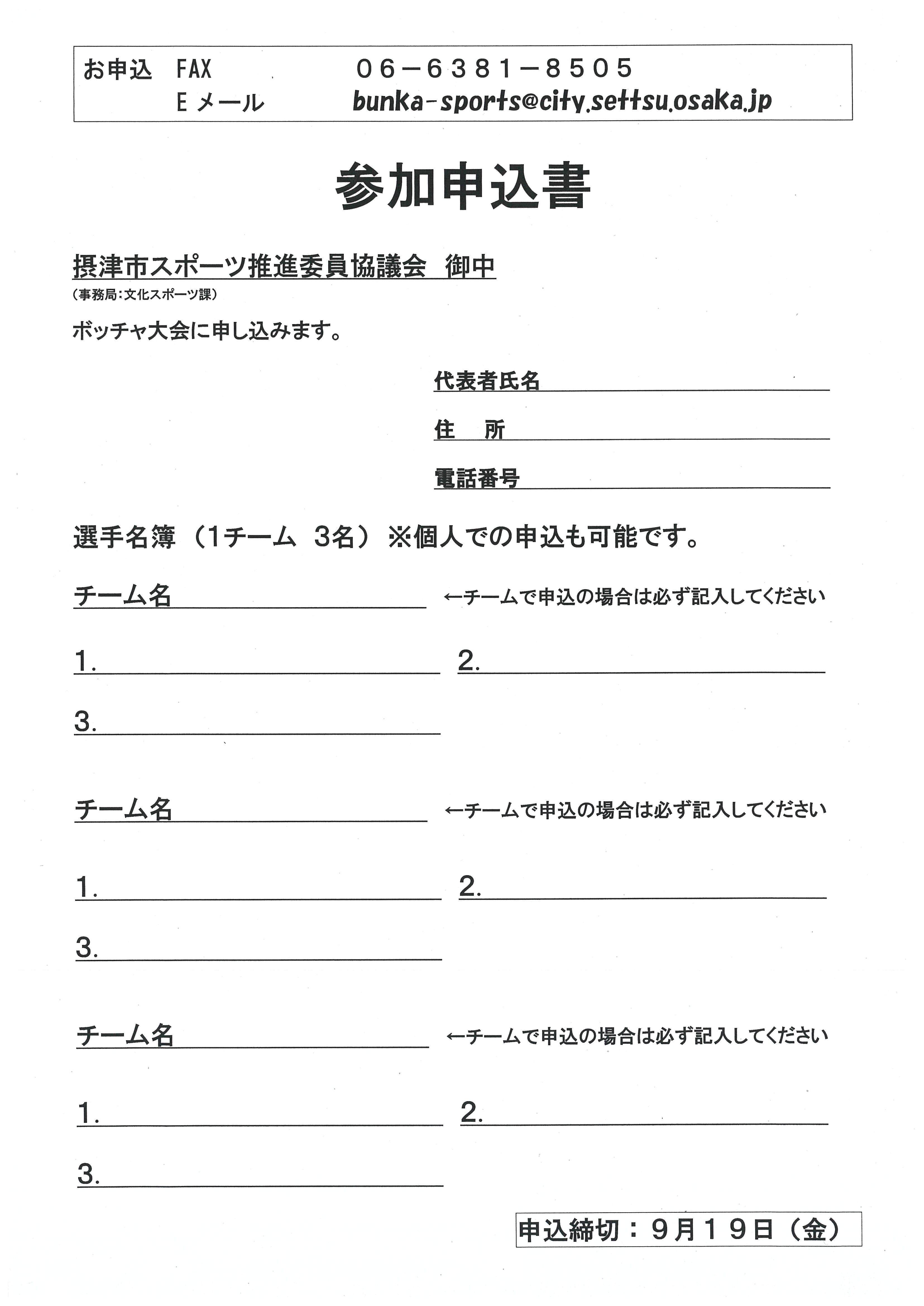 - 9月19日(金)までに以下申込フォーム、eメール、FAXにて申込が必要です。 eメールアドレス:bunka-sports@city.settsu.osaka.jp FAX:06-6381-8505 申込者の氏名・住所・連絡先を記載して、お申込みください。 チームでの申込の場合は、チーム名・選手名もご記載ください。 1チームにつき、3名での構成をお願いいたします。