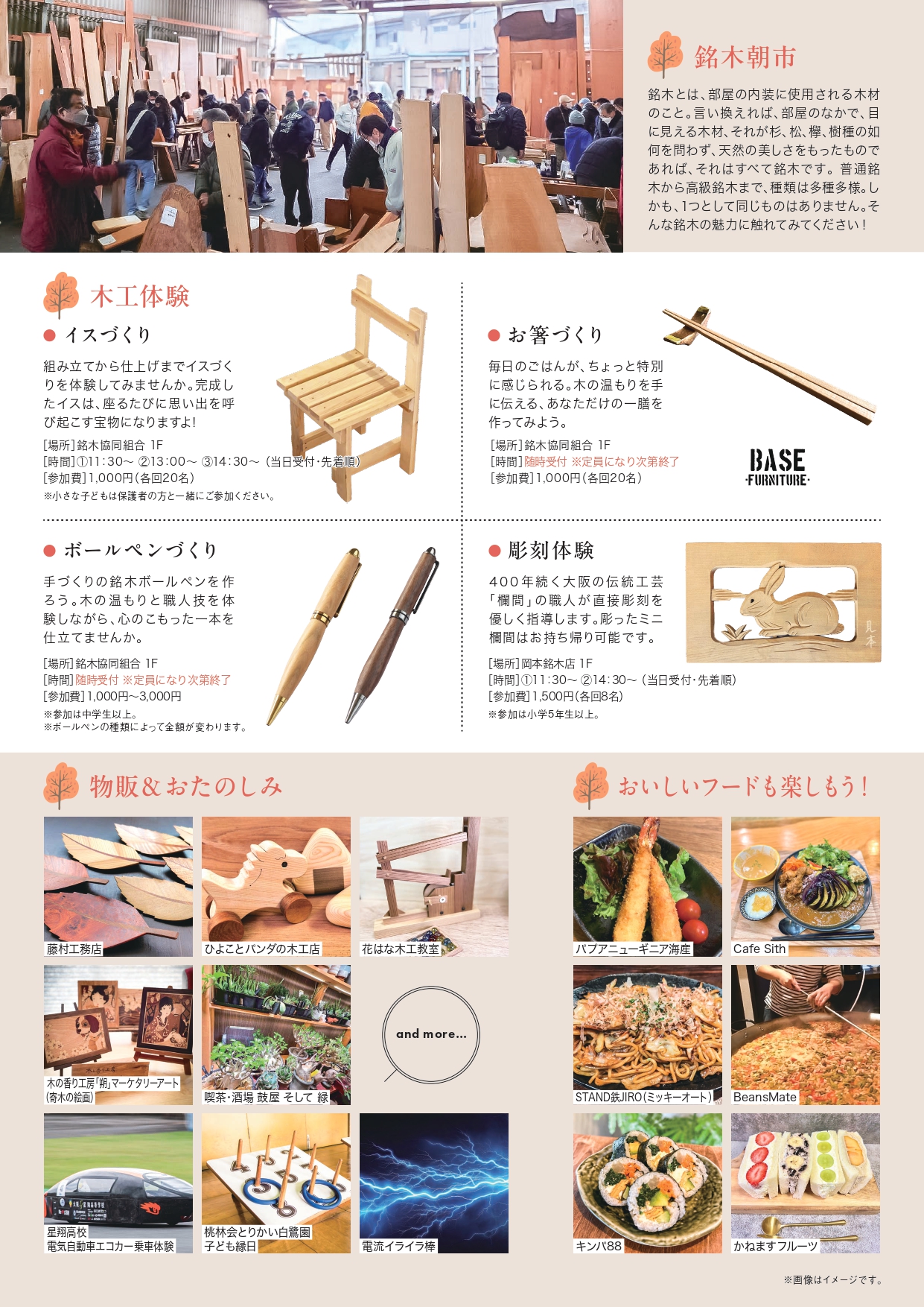 - 銘木の魅力を丸ごと体感できるスペシャルデイ 木には、ひとつひとつ違った表情があります。節や杢、色合い、香りなどそれぞれが自然が育んだたったひとつの芸術品。私たちは、そんな銘木の魅力をもっと多くの人に知ってほしくて、このフェスタを開きます。木に初めて触れるお子様にも、長年木に親しんできた方にも、心がふっとあたたかくなるような出会いがありますように、銘木の魅力に触れるワークショップやコンサート、縁日や出店などを用意させて頂きました。様々な五感で木の素晴らしさを見て、聞いて、ふれて、お楽しみください。
