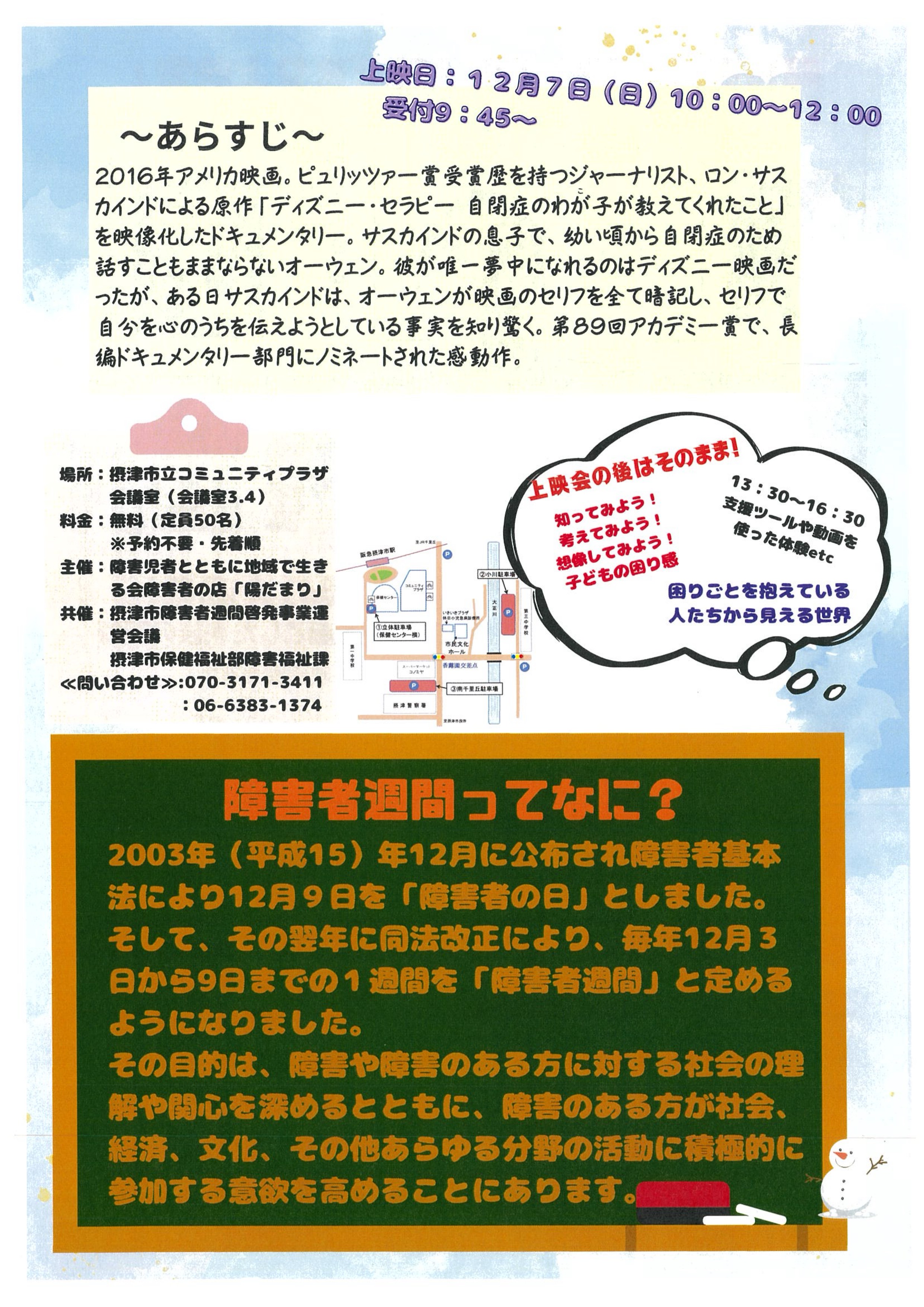 - 12月2日(火)~9日(火)は障害者週間です。12月7日(日)に上映会および体験会を開催しますので、お気軽にご来場ください。またエントランスではパネル展示も行っていますので、ぜひお立ち寄りください。【上映会】時間:10:00~12:00、定員:50名(先着順)、作品名:ぼくと魔法の言葉たち【体験会】時間:13:30~16:30、定員:なし(自由に出入り可)、内容:発達障害の子どもの困り感と支援ツールの体験会(大人の困り感にもつながる体験)