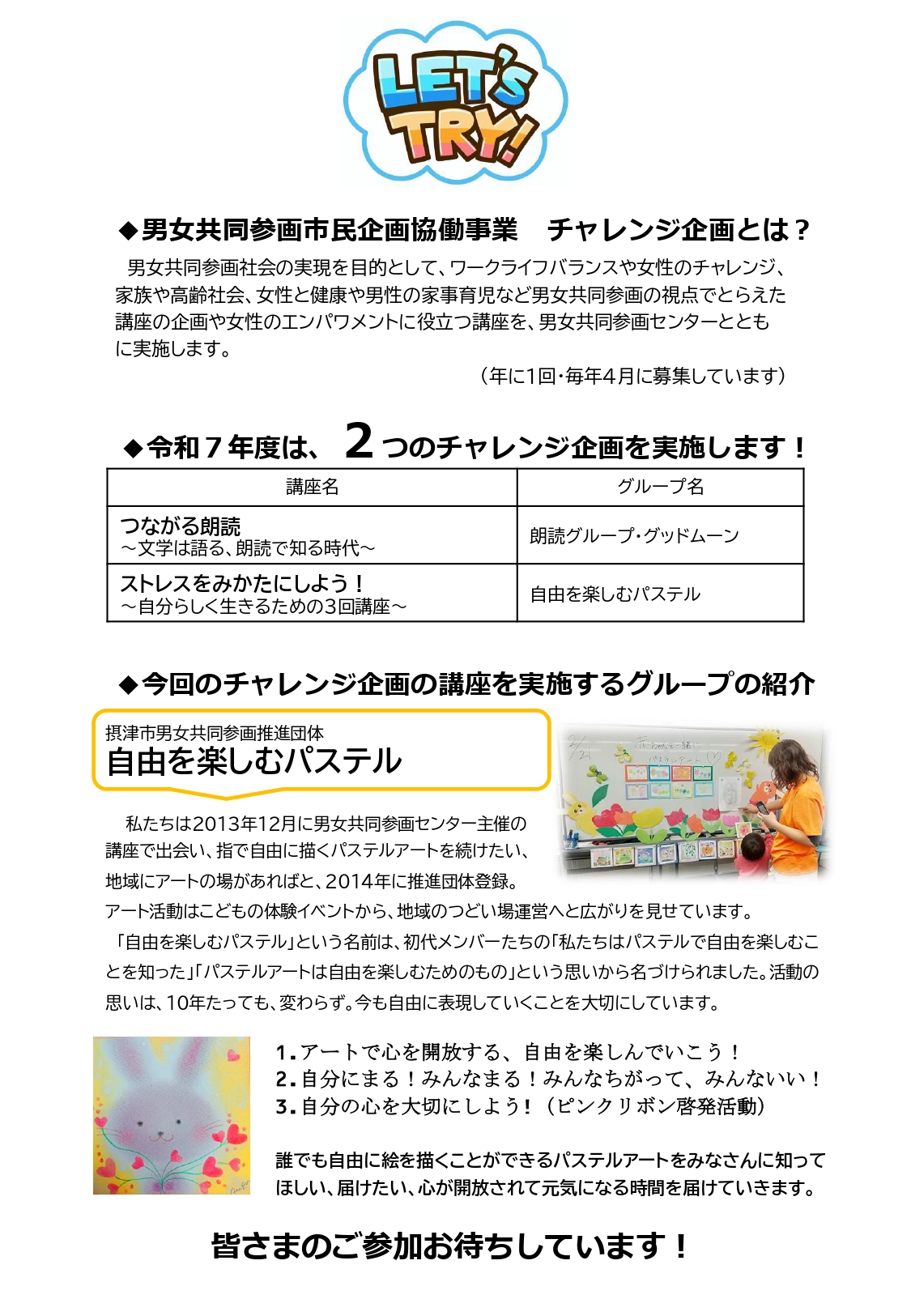 - 主催:摂津市、企画・運営:自由を楽しむパステル