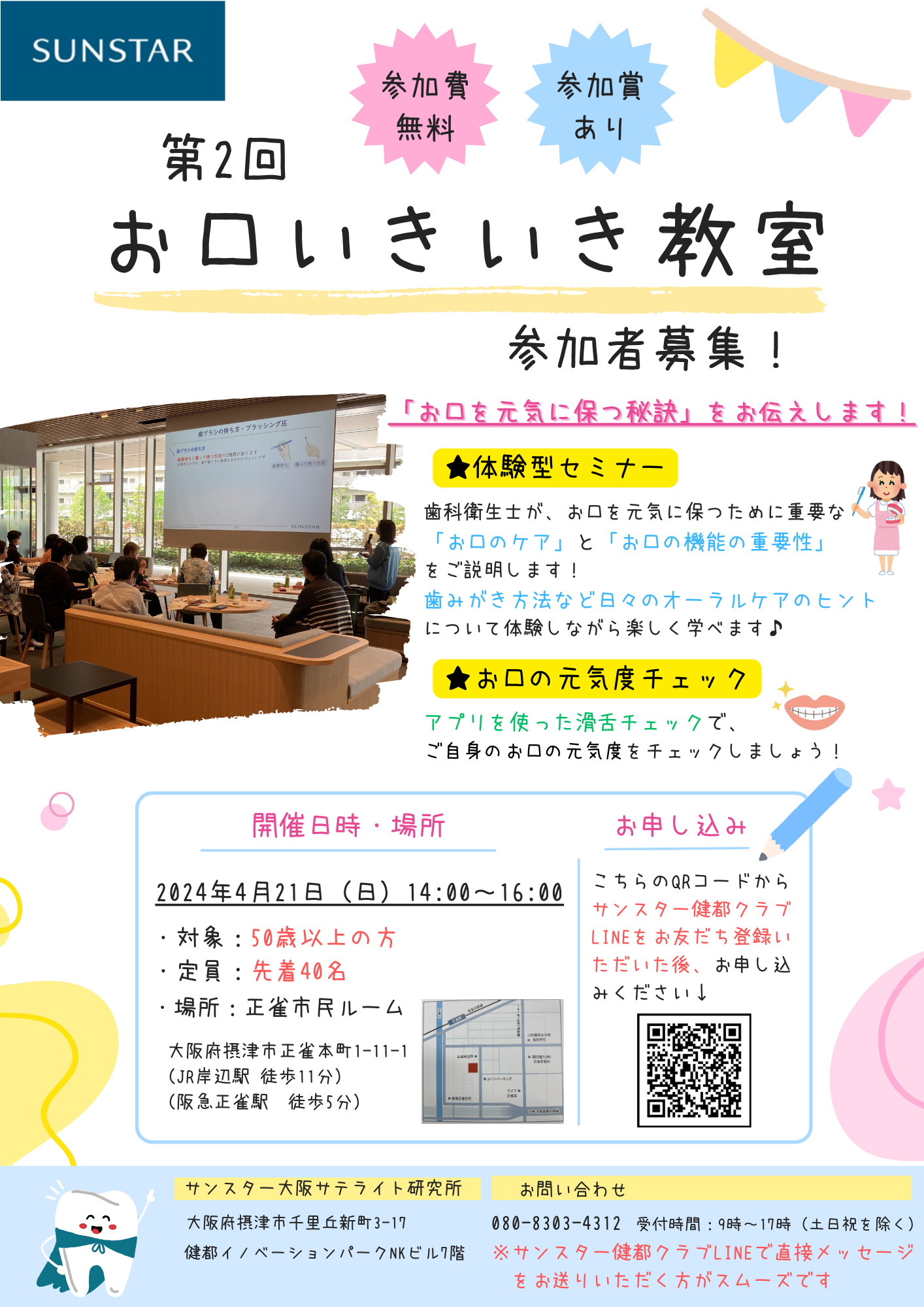 - 50歳以上の方を対象に、「お口を元気に保つ秘訣」をお伝えするイベントのご案内です。体験型セミナーでは、歯みがき方法など日々のオーラルケアのヒントについて体験しながら楽しく学んでいただけます。また、アプリを使った滑舌チェックで、ご自身のお口の元気度もチェックしてみましょう!参加賞もご用意しておりますので、ご家族やご友人の方もお誘いいただき、ぜひお気軽にご参加ください。