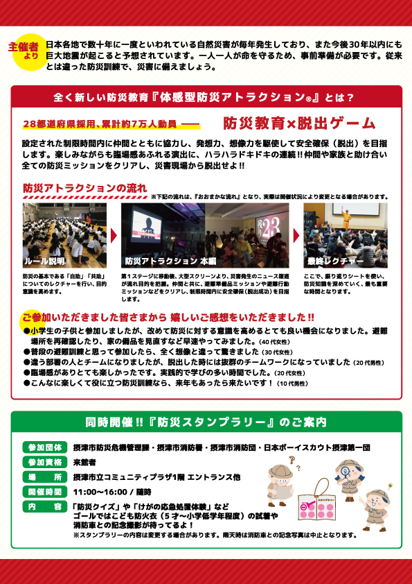 - 体験型リアル脱出ゲーム第6弾「SUPPORTER-サポーター-」 摂津市立コミュニティプラザにて開催決定! 楽しみながらも臨場感あふれる演出に、ハラハラドキドキの連続!! 仲間や家族と助け合い、全ての防災ミッションをクリアし災害現場から脱出せよ!