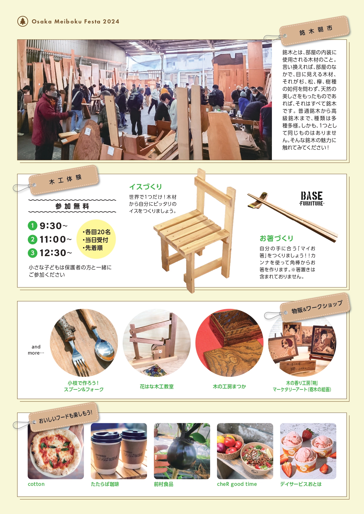 - 摂津市の名産品である銘木の魅力を体感していただくイベントを開催します! 当日は銘木朝市のほか、ワークショップスペース・物販ブース・木工体験・キッチンカーの出店もあります。