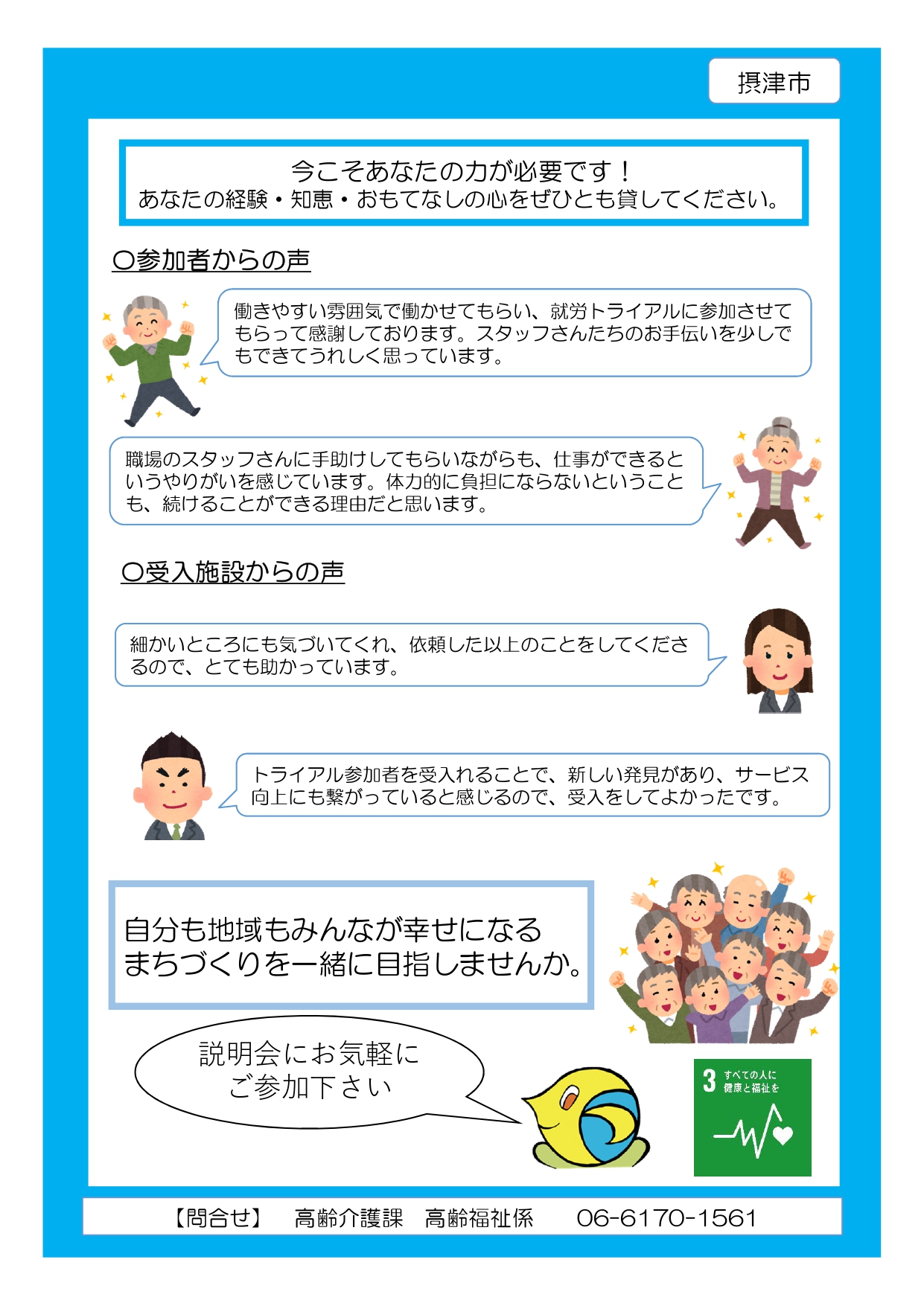 - 就労トライアルは、短時間(3か月間、週2回、2時間程度)での勤務のため、フルタイムで働くことに不安を感じている方でも、自分の体力に応じて働くことができます。 経験のない方でもできる仕事内容ですので、まずはお気軽に説明会にご参加ください。