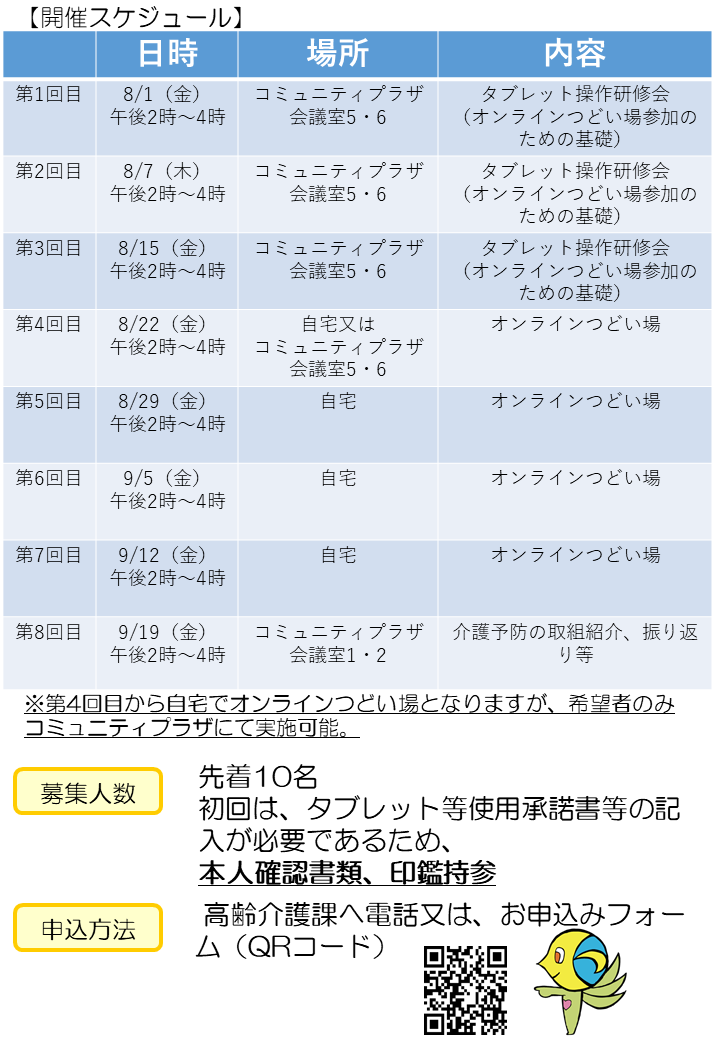 - 「オンラインつどい場」とは、対面型のつどい場と同様に介護予防を目的に、タブレットを活用し、体操や脳トレ、工作等を自宅で体験することができるものです。自宅で「オンラインつどい場」を実施する前に、タブレットの操作研修会も実施します。なお、操作研修会は、オンラインつどい場参加に必要な基礎を身につけるものとなります。 「つどい場に参加したいけど勇気がいる」、「介護予防に興味がある」方など、どなたでもお気軽にご参加ください。