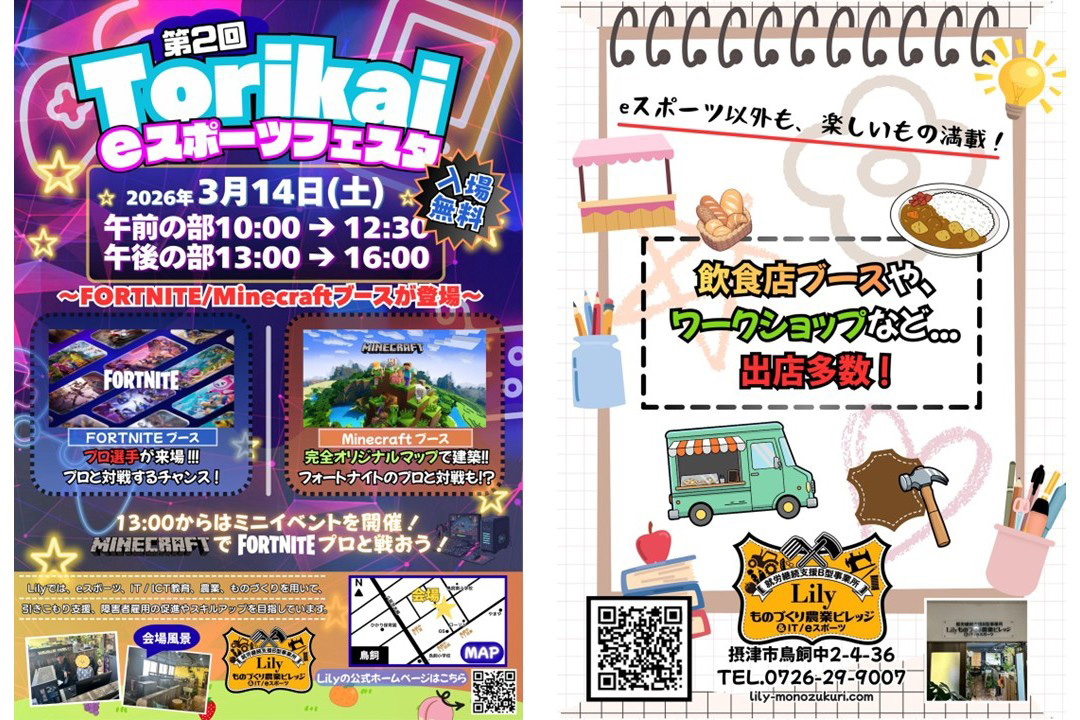 ふたつ目は、3月14日開催の「トリカイeスポーツフェスタ」です。プロ選手による指導、自由発想で建築するマイクラ企画、飲食・ワークショップブースも出展予定。地域交流と福祉の新しい接点づくりを目指しています。