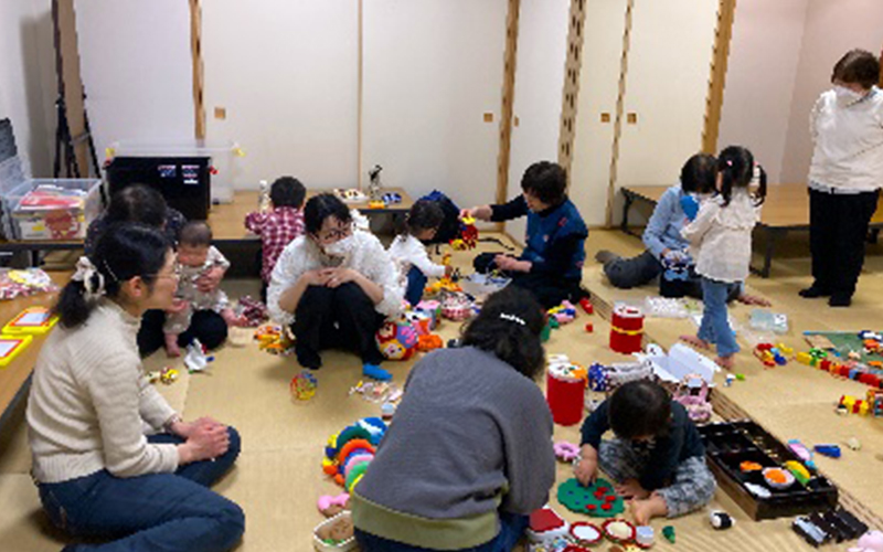 私は、講座のほかにも、小さな子どもを持つ親同士が一緒にお茶をしながら、おしゃべりの延長で気軽に相談できる「子育てカフェ」参加しています。ここでの時間が楽しく前向きな気持ちになれるよう活動しています。手作り好きなスタッフがいて、布製のおもちゃを作りながら楽しんでいます。